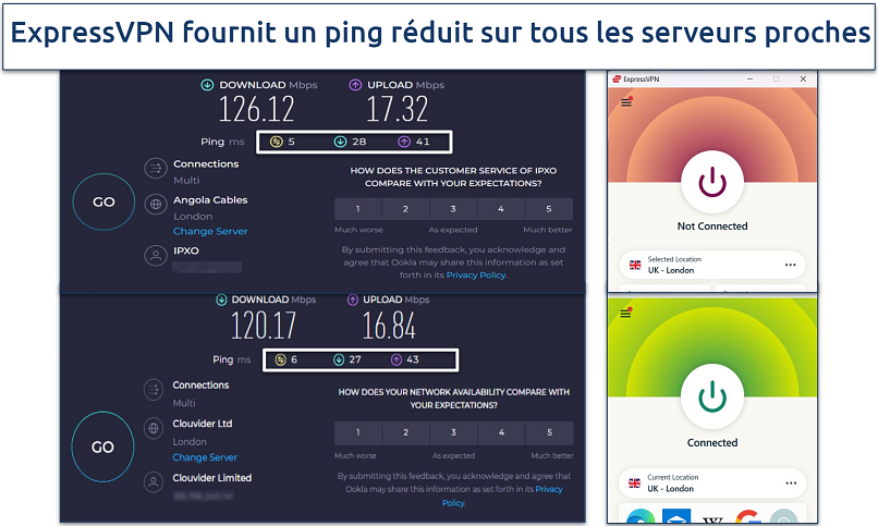 - Rapide et exempt de latence. Au cours de mes tests de vitesse, NordVPN n’est arrivé qu’en deuxième position derrière ExpressVPN. Lorsque j’ai testé des serveurs britanniques depuis Londres, j’ai constaté une baisse de débits de seulement 6 % avec un ping minime. Je n’ai observé aucune latence lors de mes parties d’Apex Legends sur PS5.