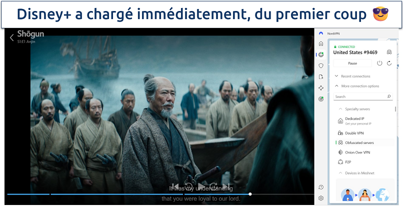 - Serveurs offusqués. NordVPN a des serveurs spécialisés qui masquent votre trafic VPN et le font passer pour du trafic classique, ce qui complique la tâche à Disney+ pour la détection et le blocage des IP appartenant aux VPN.