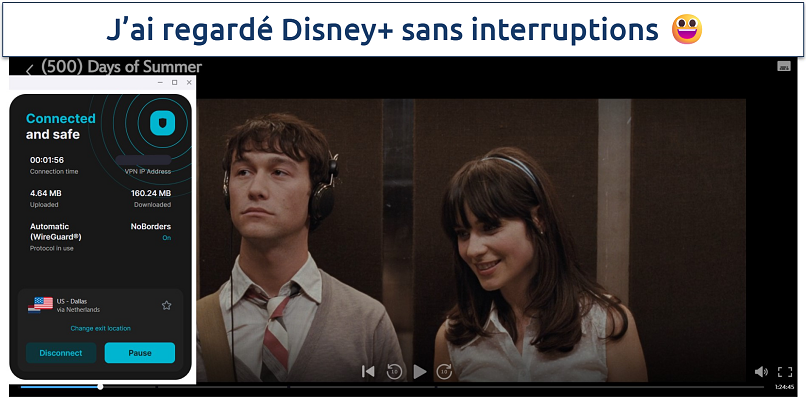 Son vaste réseau de serveurs couvrant les États-Unis permet de regarder du contenu sur Disney+ sans aucune interruption. Avec des serveurs dans 21 localisations outre-Atlantique, vous pouvez vous connecter à une ville proche de chez vous afin de bénéficier d’une expérience de streaming plus fluide. Lors de nos tests, NordVPN nous a permis d’accéder en toute sécurité à différents catalogues de Disney+, y compris ceux des États-Unis et du Royaume-Uni, avec des mises en mémoire tampon minimes.
