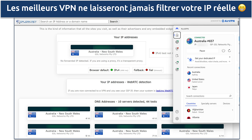 Nous vous recommandons d’utiliser un outil de test de fuite pour vérifier que votre IP a bien été modifiée. Il vous suffit d’utiliser l’un des nombreux sites web de vérification d’IP disponibles. Ils détecteront automatiquement l’adresse IP que votre appareil affiche actuellement. Si le VPN a fait son travail, votre emplacement réel sera caché et les sites web que vous consultez ne verront que l’IP du serveur du VPN. Si une adresse IP fuit, des services de streaming comme BBC iPlayer et ITVX sauront que vous n’utilisez pas une adresse IP britannique et bloqueront l’accès, même si vous utilisez un VPN à des fins de sécurité.