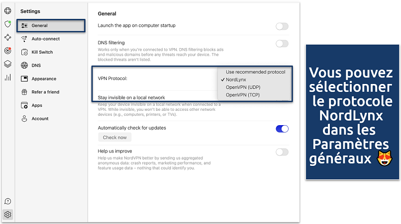 - Protocoles. Avec NordLynx et OpenVPN, vous aurez des connexions rapides et sécurisées.
