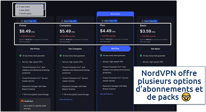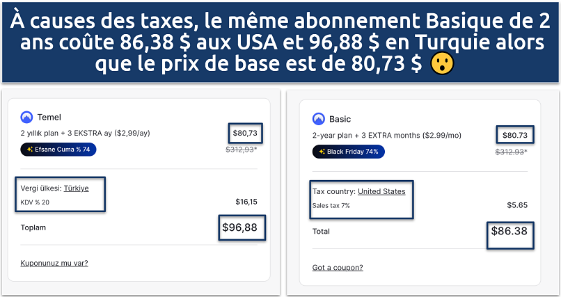 Il est intéressant de constater que les tarifs de NordVPN peuvent varier de manière significative selon votre pays de résidence. Ça vient de plusieurs facteurs, comme les taxes locales, les conditions du marché et le pouvoir d’achat du pays. Par exemple, un abonnement Basique de deux ans peut coûter 3,99 $ par mois aux US, mais 2,89 $ au Royaume-Uni et 2,85 $ en Pologne.