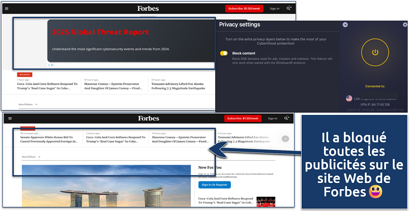CyberGhost VPN privacy settings with content blocking enabled and comparison of the Forbes site with and without adsLe bloqueur de publicités de CyberGhost empêche également les traqueurs de vous suivre sur Safari