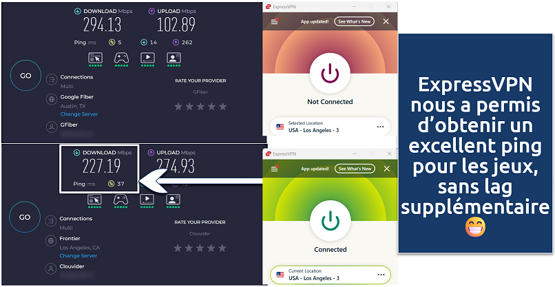 ExpressVPN app with speed tests showing minimal speed dropNotre vitesse de téléchargement moyenne n’a diminué que légèrement lors des tests sur les serveurs à proximité