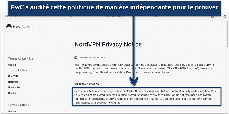 Screenshot of NordVPN’s Privacy Notice highlighting its no-logs policyLes serveurs de NordVPN basés uniquement sur la RAM effacent automatiquement toutes les données à chaque redémarrage
