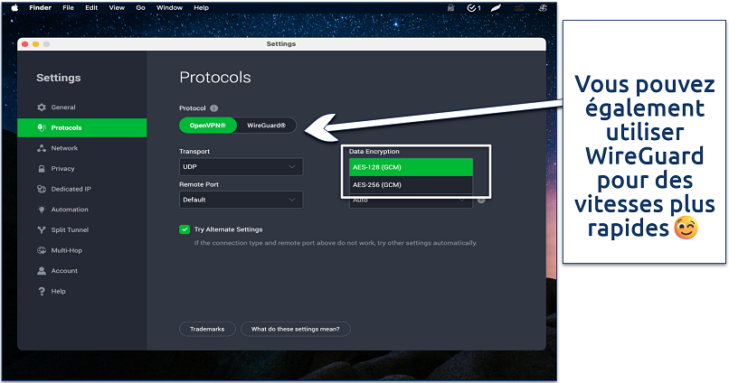 Les options de personnalisation de PIA vous permettent d’affiner les paramètres VPN pour obtenir des performances optimales dans Safari. Par exemple, avec le protocole de sécurité OpenVPN, vous pouvez choisir entre un chiffrement AES 128 bits ou 256 bits. Je préfère le 128 bits pour le streaming, car il est légèrement plus rapide tout en restant sécurisé.