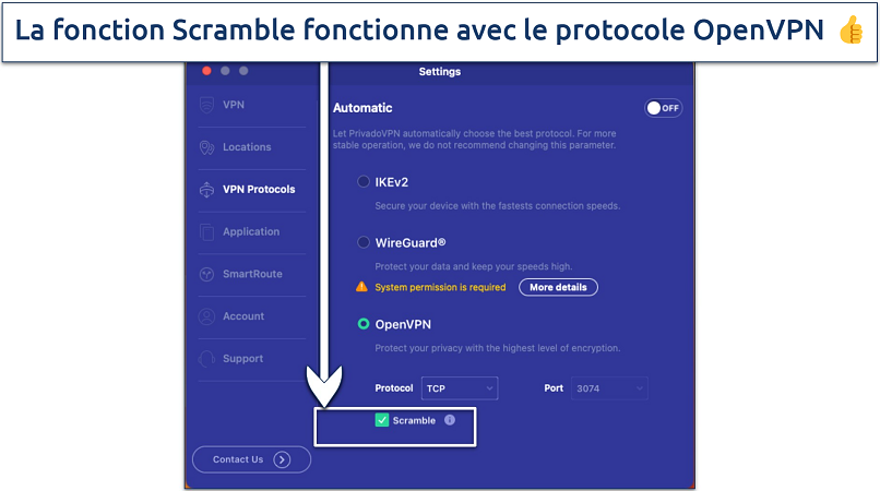 La fonction Scramble de PrivadoVPN est facile à utiliser et donne à votre trafic VPN l’apparence d’un trafic ordinaire. Celle-ci est disponible sur Windows, macOS, Android et iOS. J’ai pu aisément la trouver et l’activer dans l’application. Vous pouvez ainsi facilement profiter de vos activités en ligne en toute confidentialité en Russie (et à l’étranger).