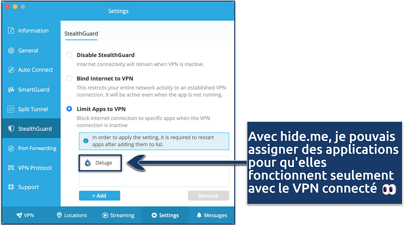 Stealth Guard vous permet de personnaliser le moment où le VPN se déclenche pour éviter les fuites de données accidentelles. Il y a deux options — Restreindre l'Internet au VPN (Bind Internet to VPN) maintient tout votre réseau connecté à hide.me, tandis que Limiter les applis au VPN (Limit Apps to VPN) vous permet de choisir des applications spécifiques (comme votre client de torrent ou serveur de jeu) pour utiliser le trafic VPN.