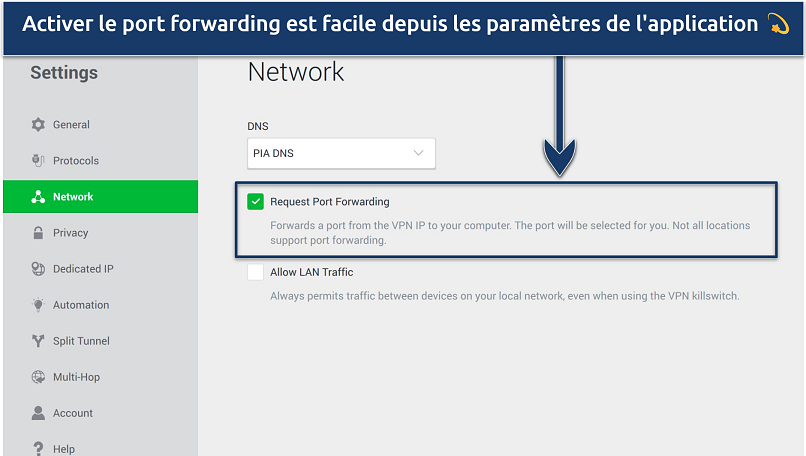 Contrairement à ExpressVPN, PIA propose une fonctionnalité de port forwarding directement dans ses applications de bureau. Cela signifie que les ports transférés sont automatiquement intégrés de manière sécurisée à travers le tunnel VPN. Le VPN offre aussi des connexions multi-sauts et une configuration SOCKS5 qui achemine votre trafic via un proxy, en plus du VPN qui garantit une sécurisé extrême pendant le torrenting.