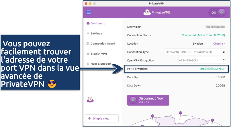 Les applications intuitives de PrivateVPN vous permettent de configurer le transfert de port rapidement. Lorsque vous vous connectez à un serveur, un numéro de port aléatoire est s’affiche de manière pratique au-dessus du bouton de déconnexion. Si vous préférez avoir le contrôle, vous pouvez changer manuellement ce numéro de port pour celui que vous choisirez. Cela signifie que vous n'avez pas à vous embêter avec des configurations compliquées ou à attendre l'approbation des demandes de transfert de port.
